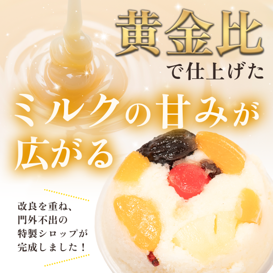「たった一杯のかき氷で誰かを笑顔にできたら」という願いを胸に改良を重ねて門外不出の白蜜とミルクシロップの黄金比が完成しました。