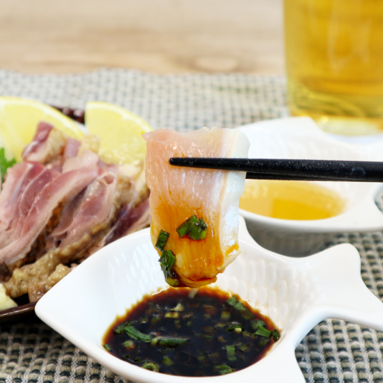 | 100gあたり | 【とり刺し】エネルギー159kcal/たんぱく質21.7g/脂質7.7g/炭水化物0.8g/食塩相当量0.2g 【とりタタキのたれ】 エネルギー79kcal/たんぱく質9.7g/脂質0g/炭水化物8.2g/食塩相当量13.5g |