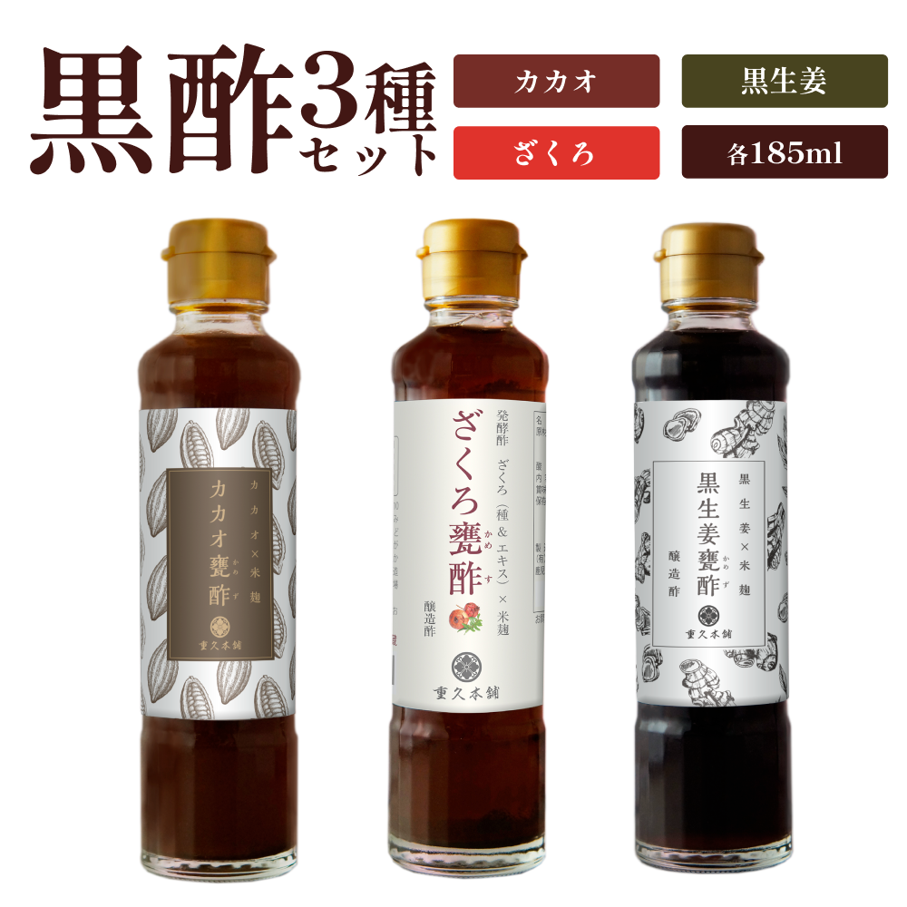 内容量 | カカオ黒酢・ざくろ黒酢・黒生姜かめ酢 各185ml |