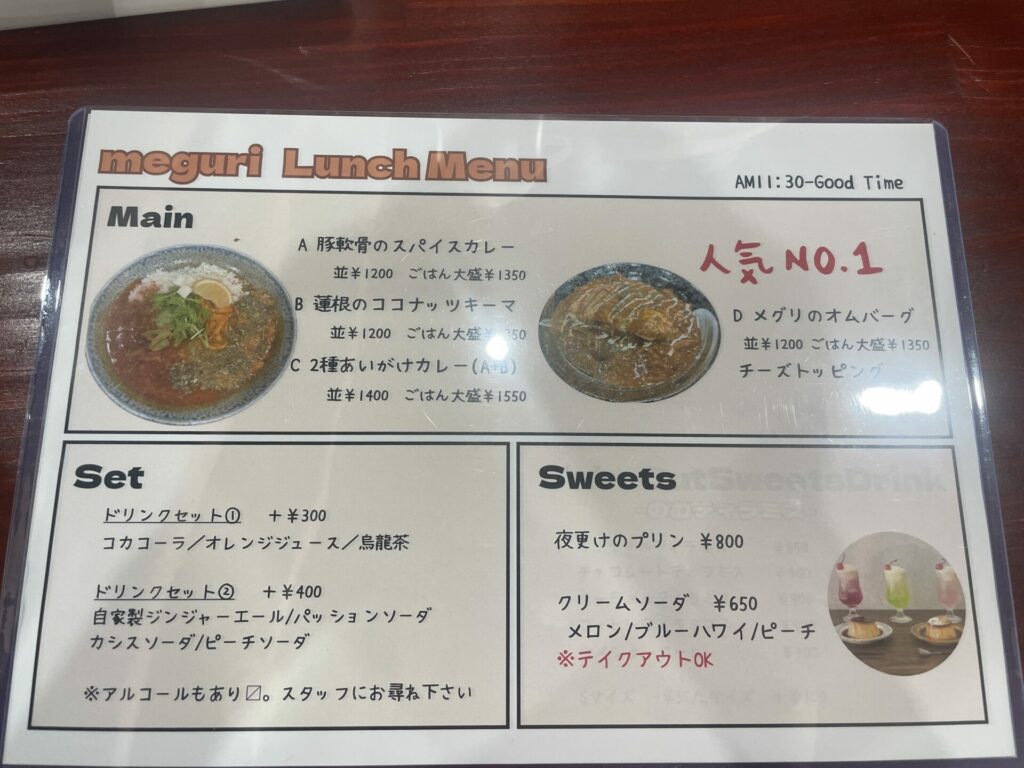 天文館電停からアーケードを真っ直ぐ歩いてセピア通りに入ってすぐのところにある「meguri」さん。