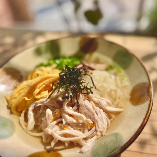 あっさりとした鶏ガラスープと、ご飯、錦糸卵、椎茸、鶏肉などの具材が組み合わさり、シンプルながら奥行きのある味に。