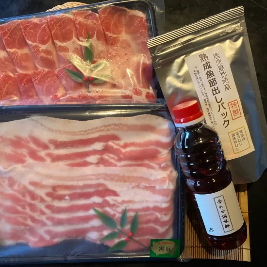 脂の甘みと旨みが特徴の黒豚(肩ロース300g・バラ300g)に、料理人も惚れ込んだ熟成ブレンド魚節出汁を合わせた、贅沢なしゃぶしゃぶ用セットです。