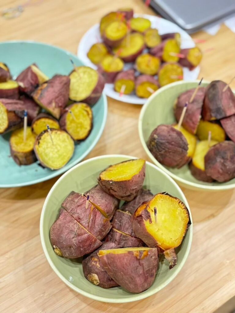 最初のワークショップでは、鹿児島県産の焼き芋4品種(あまはづき・べにはるか・シルクスイート・すずほっくり)を食べ比べ!